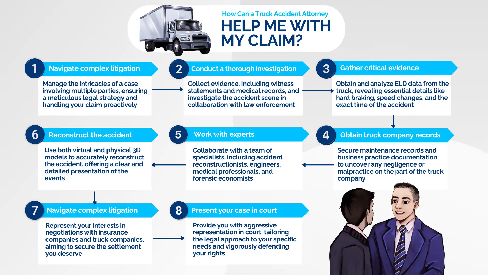 Truck accident cases are significantly different from regular car accidents, and they require specialized knowledge and expertise. Trucking laws are governed by a complex set of federal and state regulations that determine how trucking companies, drivers, and vehicles are supposed to operate on the roads. Our team of experienced truck accident attorneys has extensive knowledge of these regulations and understands how to use them to build a strong case for our clients.